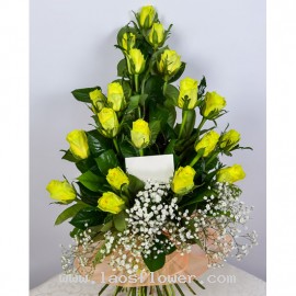 A bouquet of 19 yellow roses arrange in the pyramid shape accent with white gypsophila flowers at the bottom of the bouquet. Wrapped in orange paper and tied with yellow ribbon. The color of the flowers and materials used can be changed. Just tell us when ordering.