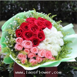 A bouquet of 32 roses consists of 10 red roses, 10 white roses, and 12 pink roses accent with white gypsophila. Wrapped in green paper and adorned with a ribbon. The color roses and materials used can be changed. Occasionally, substitutions may be necessary to create your bouquet due to the avail..
